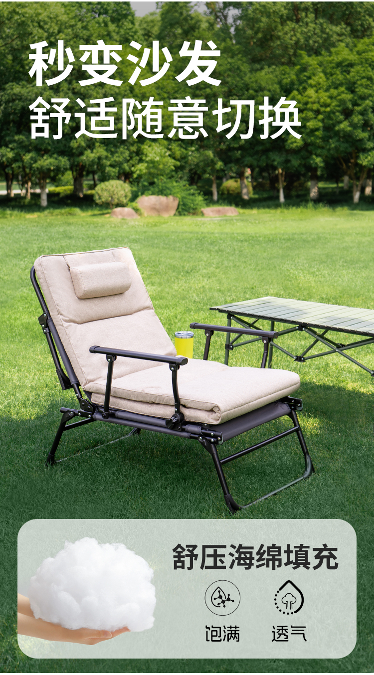 这款夏诺多吉户外多功能折叠床是户外休闲的理想选择。它具备 6 档靠背调节功能,能够根据你的需求轻松调整靠背角度,让你无论是坐着还是躺着都能找到最舒适的姿势。床体采用精钢支架,坚固耐用,承重力强。此外,它还能秒变沙发椅,一床多用,实用性极高。整体设计简约时尚,放置在绿色草坪上显得格外和谐,无论是露营还是庭院小憩,都能为你带来舒适体验。